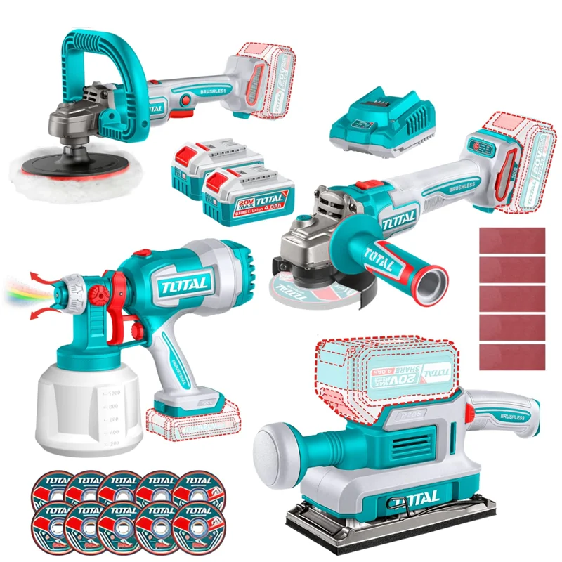 KIT AMOLADORA 20V 1000W + PULIDORA 180mm + EQUIPO PARA PINTAR + LIJADORA Industrial TOTALINCLUYE: 2 baterías 4.0 Ah (TFBLI2002) con indicador LED de carga, cargador (TFCLI2001), 10 discos de corte, mango tipo D para pulidora, bonete de pulido y kit de 5 lijas. |